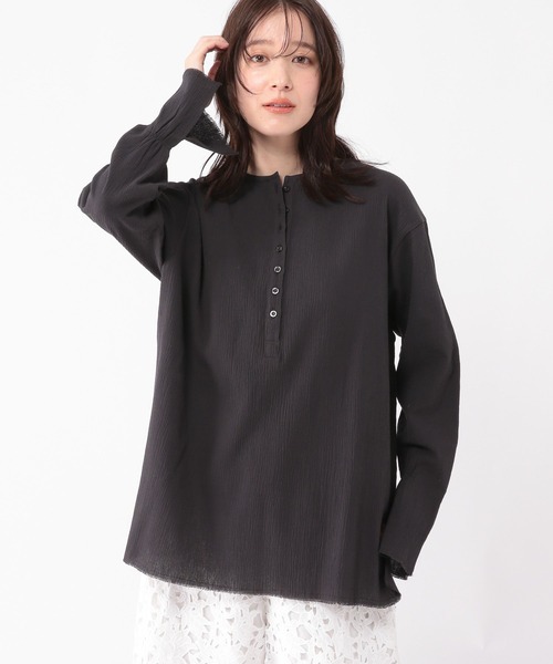 トレンドのヘンリーネックデザイン ジャストサイズながら着心地の良いブラウス ーーー 【素材】 柔らかい綿の楊柳素材を使用。 ジャストサイズながらもある程度伸びるので、着脱がしやすいのも特徴です。 ※袖口と裾は裁ち切りです。着ていくうちに糸が出てくることがありますが、気になる場合は引っ張らずにハサミでカットしてください。 【デザイン】 ヘンリーネックデザインが今年らしいブラウス。 袖口にさり気なくシャーリングを入れており、腕まくりしやすい仕様です。 一枚ではもちろん、インナーとしても活躍するので長期間お楽しみいただけます。 トップス レイヤード インナー ーーー 【スタイリング】 春はデニムパンツやナロースカートにさらっと一枚で◎ 寒さが残る今の時期は、ニットやカーディガンのインにご着用いただくのもおすすめです。