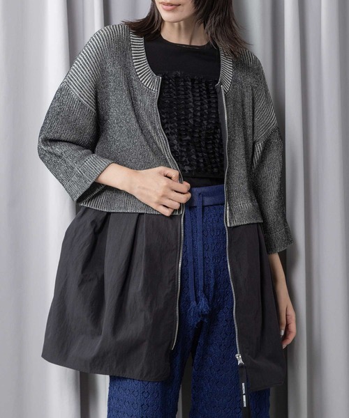 ■2026 SPRING SUMMER collection■ ニット×布帛のコンビネーションジップカーディガン 2色のストライプ柄の編み地が立体的パターンを生む ニットの柔らかさと布帛の軽さを組み合わせた異素材コンビカーディガン。 上身頃は表情のあるニット、裾は軽やかな布帛を重ねたデザイン。 動くたびに揺れる布帛が奥行きを生み、シンプルなボトムでもスタイリングが決まります。 肩の落ちたリラックスラインと程よい身幅が、大人の余裕を感じさせるシルエット。 インナーを重ねてももたつきにくく、ロングシーズン活躍します。 【DESIGN】 ■やや深めの大きく開いた衿ぐり ■2色のストライプ柄編みのショートカーディガンに、異素材のボリュームタックペプラムがジョイントしたデザイン ■フロントは逆開ファスナー開きにスライダーにはロゴテープを付けています ■Aラインシルエットのフレア裾は長めの着丈でピップラインをぼかしてくれます ■インナーにもひびかないゆったりとしたドロップショルダーシルエットでリラックスしたイージーな着心地 ■両サイドポケット有り 【MATERIAL】 レーヨン特有の微光沢のあるポリエステル混糸を4Gの3×3のリブで編み立てました ・柔らかいけど、シャリっとしたドライ感が春夏ニットに適した糸 ・伸縮性が高く、伸びっぱなしにならない、キックバック性も良い -------------------------- 裏地:なし 光沢感:なし 透け感:なし 伸縮性:あり 生地の厚さ:中肉厚 ケア方法:クリーニング -------------------------- ◆お取り扱いについては商品についております品質表示にてご確認下さい。 *光のあたり具合いやパソコンなどのモニター環境によって実際の色味と異なって見える場合がございます。予めご了承ください。 *撮影時はサンプルの為、若干のデザイン変更等ある場合がございます。予めご了承ください。 <INFORMATION> ◆商品のお気に入り登録お気に入り登録していただいた商品は、完売商品の再入荷通知やラスト1点の通知、またクーポン発行やタイムセールの通知もお届け!ぜひご登録してください。 ◆ショップ・ブランドのお気に入り登録新商品や再入荷、ショップ・ブランドのお得な情報をいち早お届け!ぜひご登録してください。