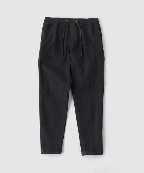 ストレスフリーな着心地を楽しんでいただける『take it easy』シリーズ最新作。 ■デザイン デニムのような見た目でありながら、イージーパンツのようにリラックスして穿ける一本。 ウエストはリブ+ドローコード仕様でフィット感の調整がしやすく、ベルトいらずで快適に着用できます。 すっきりとしたテーパードシルエットで、足元に向かって自然に締まりながら美しいラインを作るバランスに。 カジュアルな表情ながらもどこか落ち着いた印象があり、デイリーに使いやすいデザインです。 ■素材 コットンをベースに、軽さと耐久性をプラスした素材構成で、見た目はしっかりしているのに穿き心地は驚くほど柔らかい仕上がり。 ほんのりストレッチが効いているため動きやすく、長時間の着用でもストレスが少ないのが魅力です。 ウエストリブは綿100%で締め付けが少なく、肌あたりも優しい仕様。 デニム生地よりも軽く、日常使いしやすい扱いやすさもポイントです。 ■コーディネート Tシャツやスウェットと合わせればラフで快適な大人カジュアルに。 シャツや薄手ニットを合わせると、適度にきれいめな雰囲気が加わり、外出着としてもしっかり活躍します。 キレイめジャケットの外しとしてもおすすめで、その際はレザーシューズでバランスを取ると◎。 スニーカーだけでなくローファーやレザーシューズとも相性がよく、シーンに合わせて表情を変えられます。 ブラックやグレーは落ち着いた雰囲気で幅広いトップスと合わせやすく、ブルー系はコーデのアクセントとして明るさを加えてくれる万能カラーです。 本体:洗濯機洗い(弱)