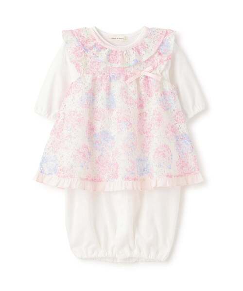 華やかなコーディネートが即完成するエプロンつきのカバーオールです。 アジサイ柄のレース生地にフリルを組み合わせ、特別感のある一着に仕上げました。 どちらもスナップボタン明きになっており、簡単にお着替え可能。 カバーオールは成長に合わせて着方を変えられる2WAY仕様です。 【透け感】透けない 【生地の厚さ】普通 【伸縮性】あり 【裏地】なし 【ポケット】なし