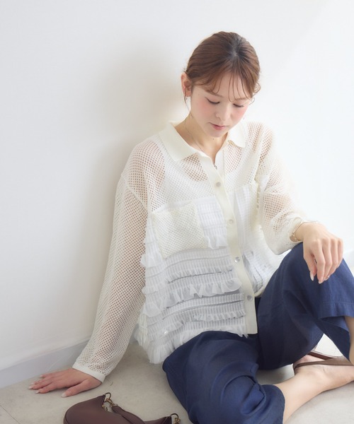 【KATHARINE ROSSオリジナル】 メッシュとフリルが織りなす、異素材のコントラストを楽しむ洗練ニットシャツ [素材] ・表情豊かなメッシュニットと、繊細なシフォン生地を贅沢にドッキング。 ・異なる質感を組み合わせることで、奥行きのある洗練された佇まいを叶えました。 [デザイン] ・身頃は柔らかなシフォン生地で切り替え、フェミニンなフリルをあしらった華やかなデザイン。 ・端正な襟元と前ボタン仕様、さらにメッシュ地の両胸ポケットが全体を引き締め、甘くなりすぎないシャツスタイルに。 ・メッシュのヘルシーな印象と、シフォンの柔らかな表情が絶妙なバランスで共存しています。 [スタイリング] ・前を閉じて、素材の重なりを楽しむ一枚着として。インナーとのレイヤードで透け感をコントロールすれば、いつものお出かけに新鮮な変化をもたらします。 ・春の軽やかな羽織りとしても重宝。シンプルな細身のパンツと合わせれば、裾のフリルが際立ち、洗練されたお出かけコーデが完成します。 ■光沢感:なし ■透け感:あり ■伸縮性:メッシュ側あり ■生地の厚さ:薄手 ※照明や光の当たり具合で色味が違って見える場合があります。 ※システムの都合上、店舗より入荷が遅れる場合がございます。 【お買い物をよりお楽しみいただくために】 ・商品のお気に入り登録をおすすめします! ♡マーククリックで登録できます。 完売カラーの再入荷や、ラスト1点になったときの通知、 セールの際に通知などお得な情報を受けることができます。 ・ブランドのお気に入り登録もご一緒にお願いいたします! 新商品や再入荷、などいち早くブランドの最新情報をお届けします。