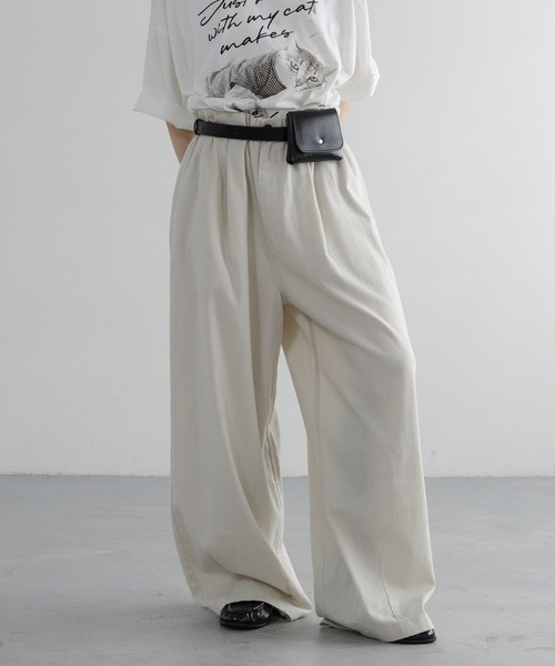 吸水速乾/UVケア/接触冷感機能が付いたアイテム! ■素材 リネンとレーヨンとポリエステルを絶妙にブレンドした別注糸を使用する事で、軽やかでクリアな表面感と柔らかな風合いを表現しました。 吸水速乾、接触冷感、UVカットなど多彩な機能で快適に着こなせる素材です。 ■デザイン ウエストにはタックを入れ、裾にはダーツを入れてボリューム感を出したバギーシルエットのトラウザーになります。 ボリュームのあるシルエットなので、シンプルなスタイリングにも程よいアクセントになります。 ベルトはイージー仕様にしているため、幅広い体型の方にお楽しみいただけます。 ブラックのみ、脇にスタッズを打ちアクセントにしています。