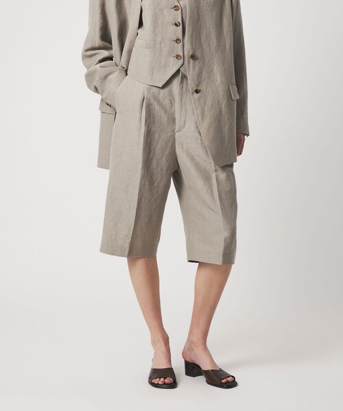 毛のやわらかさと麻のシャリ感を併せ持つギャバジン生地で仕立てたハーフパンツ。 縦長にみえる細めのシルエットがエレガントな印象ながら、大きめのトップスやチュニックに合わせて、抜け感のある旬なスタイルに導きます。 共地のジャケット、ベストと合わせて、凛とした大人らしいセットアップスタイルも素敵です。 ・ロクシンジュク限定として誕生した商品です。 ・共地のジャケット(対象品番:86222000011)、ベスト((対象品番:86162000002))、スカート(対象品番:86242000005)をご用意しています。 【注意事項】 ※商品に「取り扱い上の注意書き」、「洗濯表示」がございます場合は、使用前に必ずご確認ください。 ※商品画像は、光の当たり具合やパソコンなどの閲覧環境により、実際の色味と異なって見える場合がございます。あらかじめご了承ください。 ※商品の色味の目安は、商品単体の画像をご参照ください。 店舗へお問い合わせの際は、全国の6(ROKU)各店舗まで下記の品名/品番をお申し付けください。 品名:6 W/L GABA SRT RSJ SP 品番:86192000004