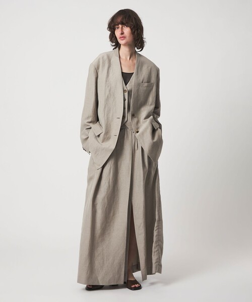 毛のやわらかさと麻のシャリ感を併せ持つギャバジン生地で仕立てたノーカラージャケット。 さっと羽織りやすくラフな雰囲気もありながら、シャープなVネックがモード感を加え大人の抜け感を演出します。 Vネックからインナーがレイヤードされ、奥行きのあるスタイルに。 内側肩口部分はパッドを入れるポケット仕様となっており、中に入れたパッドは取り外しも可能です。 共地のベスト、スカート、ハーフパンツとセットアップスタイルのほか、カーゴパンツやデニムと合わせたカジュアルアップスタイルまで汎用性の高い一着。 ・ロクシンジュク限定として誕生した商品です。 ・共地のベスト(対象品番:86162000002)、ハーフパンツ(対象品番:86192000004)、スカート(対象品番:86242000005)をご用意しています。 【注意事項】 ※商品に「取り扱い上の注意書き」、「洗濯表示」がございます場合は、使用前に必ずご確認ください。 ※商品画像は、光の当たり具合やパソコンなどの閲覧環境により、実際の色味と異なって見える場合がございます。あらかじめご了承ください。 ※商品の色味の目安は、商品単体の画像をご参照ください。 店舗へお問い合わせの際は、全国の6(ROKU)各店舗まで下記の品名/品番をお申し付けください。 品名:6 W/L GABA NC JK RSJ SP 品番:86222000011
