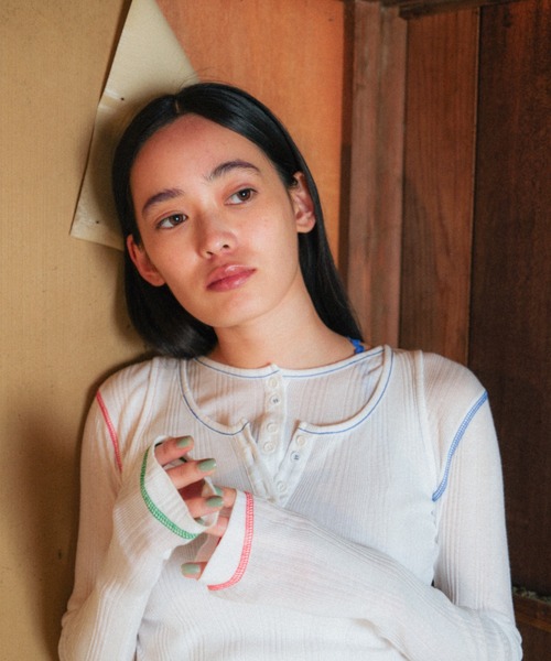 【 PAMMのサマー ロングT 】 通称「さっぱりちゃん」。 薄手のコットンリブ素材で仕立てた、さらっとした肌ざわりのロンTです。 ヘンリーネックの襟元には、ボタンを2つずつ並べてさりげないアクセントに。 少し透け感のある素材なので、インナーとの色合わせも楽しめます。 縫い目の糸はあえて表側に見せることで、肌あたりをやさしくしつつ、アクセントとして差し色に。 袖口と裾には“なみなみ”ステッチを施し、細部までPAMMらしい遊び心を込めました。 日差しの強い日には軽やかな日除けとして、肌寒い日にはインナーとしても活躍。 サムホール付きで、着こなしにもさりげないニュアンスを加えてくれます。 色々な意味で肌を気にする、PAMMのらしさのあるアイテムです。 ----------------------------------------------------- 透け感:あり 伸縮性:あり 光沢感:なし ----------------------------------------------------- 【 staff comment 】 身長:160cm / 普段サイズ:M / 着用サイズ:1 サイズ感:フィット感のあるサイズ感です。 素材感:肌あたりが優しく、さらりとしたコットン素材です。 着心地:程よい透け感があり、涼しく着ていただけます。 ----------------------------------------------------- ※掲載画像の商品の色味は、屋外や屋内の光の照射や角度により実物と色味が異なる場合がございます。 また表示のサイズ感と実物は若干異なる場合もございますので、予めご了承ください。 ※着用、お取り扱いの際は、商品についている品質表示を必ずご確認下さい。 【 PAMM's policy 】 PAMMは線路沿いの小さなアトリエから日々アイデアを生み出しています。 まず大きな布に筆や染料で描く事から始まり、手作業ならではの発見やハプニング、目の前で制作しながらトライ&エラーを繰り返しながら作り上げる事を大切にしています。 パジャマの生地はどこで裁断してもバランスが良くなるようデザインしています。 残布が出ないよう工場で端から順に裁断することによって同じ物が二つとない一点物のパジャマが出来上がるのです。 偶然を楽しむ遊び心とデザインの客観視が必要とされますが、それはアトリエで作業してるからこそ出来る事だと考えます。 誠意を持って環境問題に取り組むことを、わたくしどもPAMMのポリシーとしています。 捨ててしまう生地を最小限にしたスペシャルなパジャマ。 あなたのお気に入りにして頂けたら幸いです。 ------------------------------------------- お気に入り登録のオススメ ▼商品のお気に入り登録▼ 再入荷、残り1点、セールなどの通知を受け取ることができます。 ▼ブランドのお気に入り登録▼ 新商品や再入荷、ショップのおすすめトピックスなど、いち早くブランドの情報を受け取ることができます。 ------------------------------------------- 【PAMM/パム】 ファッションブランド " spoken words project " がディレクションするホームウェアブランド。 オーガニックコットンや再利用素材などサステナブルのアイテムを中心に展開。 着る人自身が考え、そして手に取るブランドを目指しています。