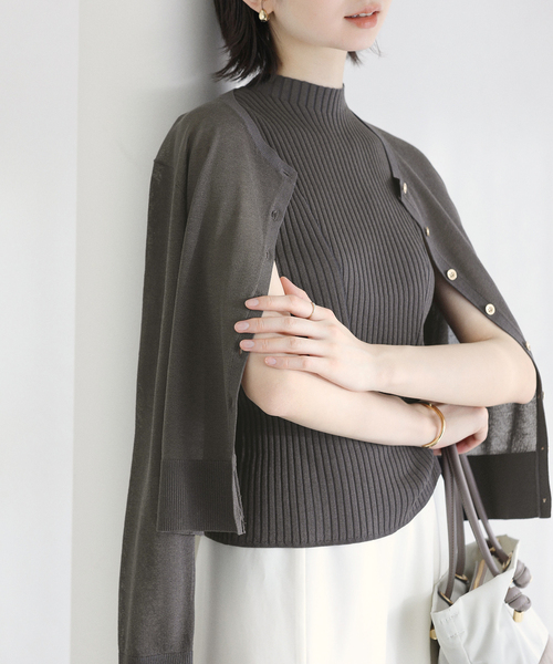 【2026SS】 La Totalite 軽やかなシアーカーディガンとリブニットがセットになったアンサンブル。 程よく透け感のあるカーディガンがコーディネートに抜け感をプラスし、上品で女性らしい印象に仕上げてくれます。 コンパクトなリブニットは一枚でも着やすく、セットでも単品でも活躍。 デイリーから通勤スタイルまで幅広く着回しできるアイテムです。 ********************** 透け感:ホワイト、パープルCはあり 裏地:なし 伸縮性:あり 光沢感:なし 生地の厚さ:普通 ********************** 【スタッフ着用コメント】 《スタッフ名:mizuki》 身長:160cm/体型:普通/普段サイズ:S、M/着用サイズ:フリー サイズ感:女性らしさが引き立つコンパクトなサイズ感。リブ編みのインナーはボディラインを拾いすぎず、程よくフィットしました。 素材感:肌に直接触れてもチクチクしない伸縮性のあるニット素材。 着心地:伸縮性があり柔らかな着心地でストレスフリーでした。 ********************** ※取り扱いについては、商品についている品質表示でご確認ください。 ※照明の関係により、実際よりも色味が違って見える場合があります。 またパソコン・スマートフォンなどの環境により、若干製品と画像のカラーが異なる場合もございます。 ※商品の色味は、商品アップ画像をご参照ください。 着用モデル身長: 162cm 164cm 着用サイズ:フリー 本体:手洗い可能