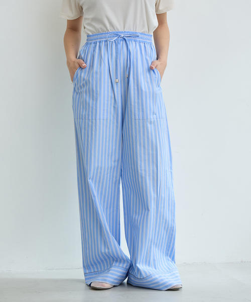 【2026SS】 IENA LA BOUCLE ミニマルに映えるクリーンストライプパンツ。 スペインのインポートメーカー、SIDOGRAS社に別注したオリジナルストライプ素材を使用。 クリーンで洗練された配色が印象的な一本です。 コットン100%ながらしなやかでさらりとしたタッチが特徴。 軽やかな着心地でありながら、上品な表情を保ちます。 ウエストはドロースト仕様のイージーデザイン。 パジャマパンツのようなリラックス感がありつつも、ワイドストレートシルエットでクラス感をプラス。 ラフになりすぎず、大人のリラックススタイルに最適です。 同素材のキャミソールやシャツとのセットアップスタイルもおすすめ。 洗練された抜け感を演出できる、着回し力の高い一着です。 ※シリーズ コットンストライプスリーピーシャツ(品番 26050914111010) コットンストライプリボンキャミソール(品番 26051914124010) ********************** 透け感:なし 裏地:なし 伸縮性:なし 光沢感:なし 生地の厚さ:普通 ********************** ※取り扱いについては、商品についている品質表示でご確認ください。 ※こちらの商品は、IENA LA BOUCLE(NEWoMan新宿店)でのお取扱いとなります。 直接店舗へお問い合わせの際は、上記店舗へお願い致します。 ※照明の関係により、実際よりも色味が違って見える場合があります。 またパソコン・スマートフォンなどの環境により、若干製品と画像のカラーが異なる場合もございます。 ※商品の色味は、商品アップ画像をご参照ください。 着用スタッフ身長:157cm 着用サイズ:38 詳細着用スタッフ身長:163cm 着用サイズ:38 本体:洗濯機洗い(弱)