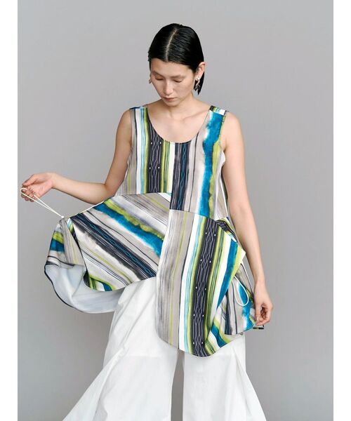 今季のシーズンテーマ【地層】をタイダイストライプ柄に落とし込んだオリジナル柄アイテム。 柔らかなタイダイに鮮やかなカラーを掛け合わせ、幾何学柄を混ぜ込んだ印象的な柄になっています。 立体的なタックデザインを掛け合わせ動きのあるデザインに◎ 夏にさらっと着れる滑らかな素材感です。 同素材でパンツも展開しているのでセットアップでの着用もオススメです。 この商品は【522630701101 TIE-DYE STRIPE PT】とセットアップで着用いただけます。 ----------------- 透け感:なし 生地の厚さ:普通 裏地:なし 伸縮性:なし -----------------