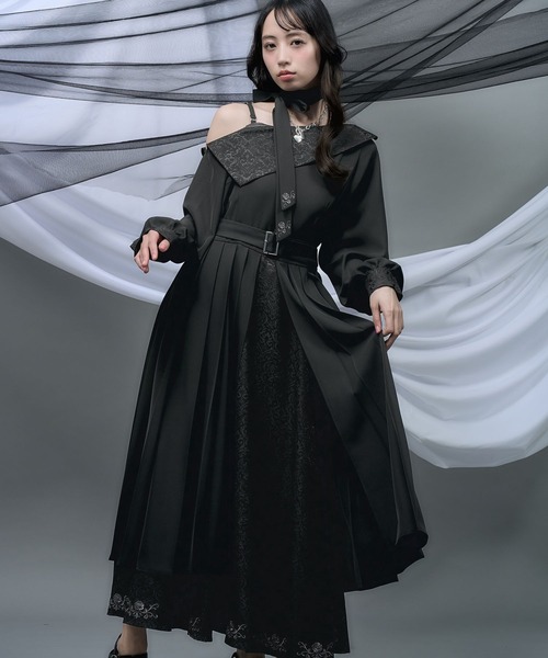 ーーー 「NANA」の世界観と「HARE」のモードな感性が融合 アシンメトリーな襟元と繊細なジャガード使いが目を惹くクリーンでモードなワンピース ーーー point □漫画NANAの世界観とHAREのモードな感性が融合したコラボアイテム □シャープな折り返し襟と、肩を露出したオープンショルダーになっており、左右非対称なデザインがクラシカルで女性らしい雰囲気に □襟、袖口、そして裾のレイヤード部分に、同系色の糸で織られた繊細なジャガード生地があしらわれており、無地の中に浮かび上がる模様が奥行きと高級感を演出 □フロント部分に太めのボックスプリーツを入れることで、裾に向かって美しく広がるデザイン □付属の共布ベルトでマークすることで、ロング丈ながらもメリハリのある脚長シルエットに □同生地のボウタイがセットになっており、首に巻いたスタイルや肩紐に使用したりと様々なスタイルが楽しめる □裾とボウタイにはさりげなく配色カラーで刺繍を施し、モードさをプラス ※加工を施した画像を使用しております。 実物と色味が異なる可能性があるため、色味は詳細後ろにある生地寄り画像を参考にお願いいたします。 あらかじめご了承下さい。