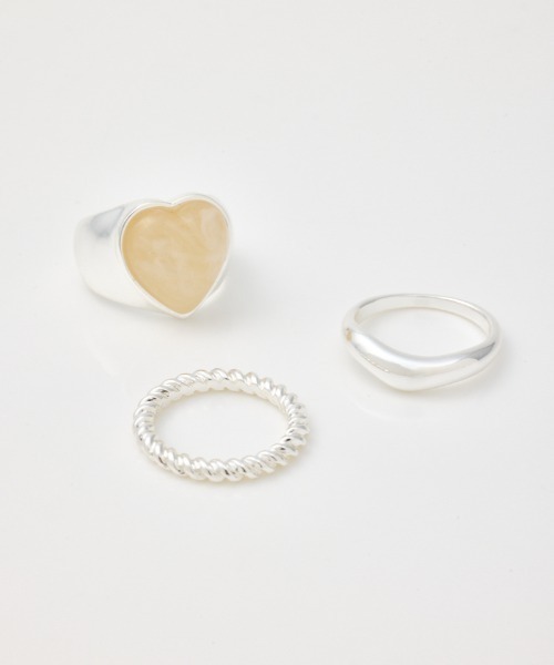 SPRING & SUMMER ( 春服 / 夏服 ) ■ポイント 異なるデザインを組み合わせた、3連のアソートリングセット。 ■ディテール ハートのモチーフは大きなストーンモチーフとなっていて、カラーリングがとっても可愛いデザイン。 ■スタイリング 3連で重ね付けしてボリューム感を楽しむのはもちろん、1点ずつ別の指に着けてアレンジするのもおすすめ。 ※お取り扱い上のご注意 体質によってはかぶれ等を生じる場合がありますので、皮膚に異常を感じた時は、ご使用をお止めいただき、専門医にご相談下さい。 変色の可能性がある為、消毒液等の薬品の付着は避けてください。 [注意事項] ※画像の商品はサンプルです。実際の商品と仕様、加工が若干異なる場合があります。 ※画像の商品は光の照射や角度、お使いのモニター環境により、実物と色味が異なる場合がございます。 ※着用、お取り扱いの際は、アテンションタグをご確認ください。 ※弊社管理上のカラーを表記しており、タグのカラー表記と異なる記載となっている場合がございます。 ※こちらの商品は、RODEO CROWNS WIDE BOWL 独自の採寸方法となっています。本サイトのサイズガイドと採寸方法が異なる場合がありますのでご了承ください。 ▼商品のお気に入り登録 お気に入りアイテムの再入荷・在庫1点などの通知を受け取ることができます。 ▼ブランドのお気に入り登録 新作アイテムの入荷や人気アイテムの再入荷、おすすめトピックスなど、いち早くブランドの情報を受け取ることができます。