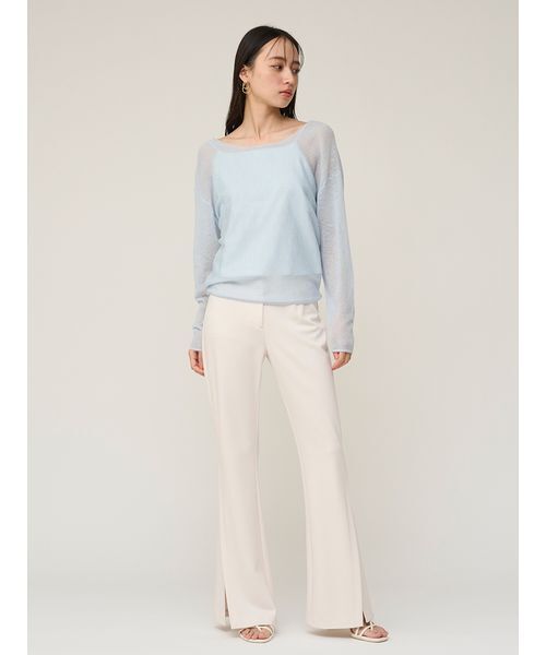 【着心地よい素材で仕上げたモードなフレアパンツ】 【Design/Styling】 柔らかなポンチ素材で仕立てたフレアパンツです。 膝下から裾にかけて入れた深めのスリットが、モードな印象をプラス。 テンションのある生地でストレスフリーな履き心地ながら、程よく体にフィットします。 【Fabric】 伸縮性のあるポンチ素材を使用。 アイボリー、ブラック、ネイビーの3色展開。 透け感:ややあり 裏地:あり 伸縮性:あり 光沢感:なし 生地の厚さ:普通 【おすすめ骨格タイプ】 ■骨格ストレート ■骨格ウェーブ ■骨格ナチュラル ※照明の関係により、実際よりも色味が違って見える場合があります。 またパソコン・スマートフォンなどの環境により、若干製品と画像のカラーが異なる場合もございます。予めご了承ください。 商品の色味は、商品単品画像をご参照下さい。 ※商品画像はサンプルのため、色味やサイズ等の仕様に変更がある場合がございますので、予めご了承ください。