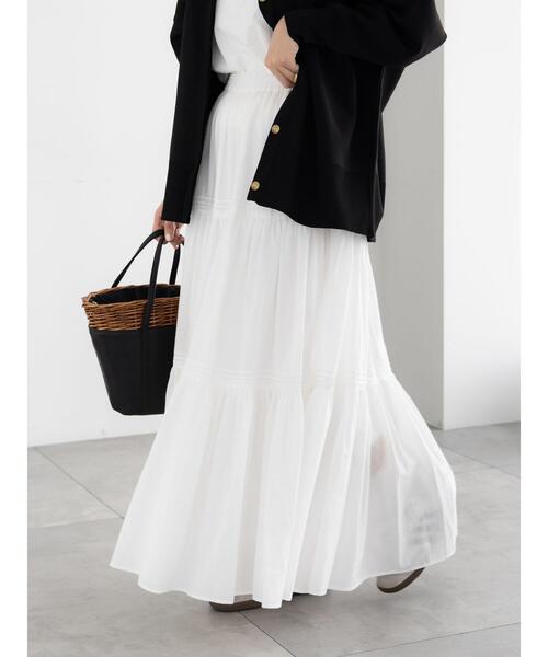 軽やかなコットンボイル素材を使用した、涼しげな印象のティアードスカート。 ふんわりと広がるシルエットが、動くたびにやさしい表情を演出します。 シンプルなカットソーを合わせてカジュアルに、ブラウスを合わせてきれいめに仕上げるのもおすすめ。 シーズンムードを高めつつ、デイリーに取り入れやすい一枚です。 【その他採寸】 F ウエスト:[ゴム仕様]64cm ※商品画像は、撮影環境やお客様のご利用のPC・スマートフォンのモニター環境などにより実物と色味に差異がある場合がございます。 ※着用画像はサンプルを使用して撮影しております。製品と一部仕様が異なる場合がございます。予めご了承ください。 ★《お気に入り登録》でお得な情報をGET★ ① 商品ページ内のハートマークをクリック! ② 以下通知が受け取れます! 「再入荷」「ラスト1点」「特別セール」etc.. \ブランド、ショップのお気に入りも是非!/