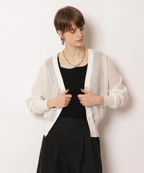 ほんのり透け感のある軽やかな素材が魅力のシアーカーディガン。 コンパクトなシルエットで、すっきりとしたバランスで着こなせる一枚です。 ワンピースに羽織って上品にまとめたり、デニムやワイドパンツと合わせたカジュアルなスタイリングもおすすめ。 日除けや冷房対策としても取り入れやすく、デイリーに活躍するアイテムです。 【ご注意】 ※撮影照明の関係により、実際の商品と色味が異なって見える場合がございます。 また、パソコン・スマートフォンなどの環境により、製品と画像のカラーが異なる場合もございます。 予めご了承ください。 ※商品画像はサンプルのため、色味やサイズ等の仕様に変更がある場合がございますので、予めご了承ください。