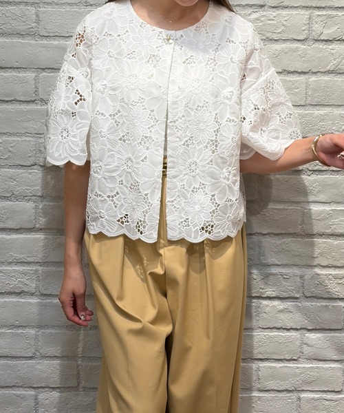 繊細なフラワーレースを贅沢に使用した、華やかなブラウスジャケット。 立体感のあるレースが上品な印象を演出し、羽織るだけでコーディネートを華やかに引き立てます。 テーパードパンツやワイドパンツと合わせたきれいめスタイルはもちろん、デニムと合わせてカジュアルダウンした着こなしもおすすめ。 ワンピースの上にさらりと羽織るスタイリングにも好相性です。 【ご注意】 ※撮影照明の関係により、実際の商品と色味が異なって見える場合がございます。 また、パソコン・スマートフォンなどの環境により、製品と画像のカラーが異なる場合もございます。 予めご了承ください。 ※商品画像はサンプルのため、色味やサイズ等の仕様に変更がある場合がございますので、予めご了承ください。