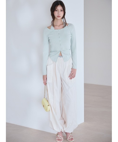 【Chacott(チャコット)とSNIDEL(スナイデル)コラボレーション第3弾!】 【 レイヤードウエストやレースディテールが目をひくナイロンレースパンツ】 【Design/Styling】 日本のバレエ業界を牽引し続けるブランド 「Chacott」 とのコラボレーション第 3 弾。 春夏らしく優しいカラーリングとランダムに入れたレーステープディテールが目をひく、ナイロンレースパンツが届きました。 エレガントなバレエの世界観を表現した上品でスペシャル感のあるアイテムです。 シボ感を加えて柔らかな表情を出したUV加工のナイロン生地のワイドパンツに、繊細なフラワーレーステープを流れるラインのようにドッキングさせてヘルシーな抜け感を出し、女性らしく軽やかな仕上がりに。裾口にはゴムのドロストを施しているのでバルーンシルエットにアレンジ可能です。 ウエスト位置には、ベルトループデザインに Chacott と SNIDEL ロゴを入れたゴムウエストをレイヤード。 ややハイウエストのデザインで今季らしいバランスを叶えます。 クロップド丈のトップスとも相性抜群です。 ベルトループからは細ナイロンリボンを垂らし、SNIDELらしい女性らしさを引き出しました。 同素材でお作りしているナイロンレースブルゾン(SWFJ261105)とのセットアップコーデもおすすめです。 柔らかく薄手のナイロン生地ですが、裏地付きなので安心してご着用いただけます。ポケット付きです。 【Fabric】 オフホワイト、ライム、ピンクの3色展開です。 <8店舗でしかGETできない限定カラーNVYもご用意> ※店頭は3/18(水)より発売です。 ※数量限定です。予めご了承ください。 【販売店舗】 ルミネ新宿2店 ルミネ有楽町店 ルミネ横浜店 ルミネ池袋店 ルミネ北千住店 ルミネ大宮店 ルミネ立川店 ルミネ町田店 ※商品画像はサンプルの為、レースの柄が、お届けの製品と多少異なる場合がございますので、予めご了承ください。 透け感:ややあり 裏地