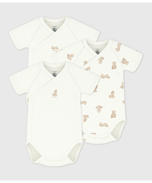 パターン違うキュートなクマ柄で揃えた半袖あわせボディ3枚セットです。お着替えがしやすいよう、スナップボタンが施されているので外出時も安心。何枚あっても嬉しいアイテムは、出産祝いなどのギフトにもおすすめです。※1.プリントは永久的なものではなく、もみや摩擦でひび割れたり、繰り返しの洗濯によるプリントの変色や、脱落が生じる場合があります。中性洗剤などで単独洗いをしてください。