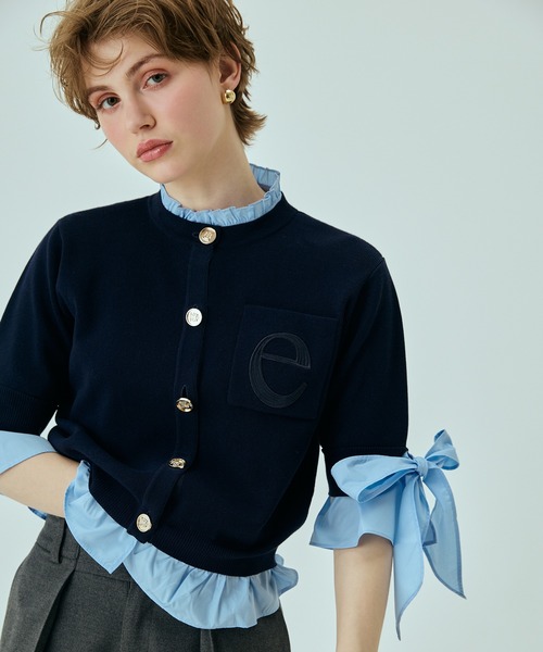 きちんと感と遊び心を纏う、大人気Aattachedシリーズ。 【Design】 コンパクトなニットカーディガンにシャツスリーブをドッキングしたデザイン。 立体感のあるスリーブと配色カフスがアクセントになり、1枚で着映えするアイテムです。 フロントのゴールドボタンがクラシカルな印象をプラスし、上品な仕上がりに。 【Styling】 ハイウエストボトムと合わせてバランスよく。 ミニスカートでフェミニンに、スラックスでモードにまとめるのもおすすめ。 羽織としてもトップスとしても着用できる万能デザイン。 【Fabric】 程よくフィット感のあるニット素材と、軽やかなシャツ地を使用。 異素材のコントラストが、洗練されたスタイルを演出します。 【Material】 表地:綿45%レーヨン43%ナイロン12% 別布:ポリエステル90% 綿10% 刺繍糸:ポリエステル100% 手洗い可 ドライクリーニング可 ウェットクリーニング可 厚み:□薄手 ■普通 □厚手 透け感:■なし □あり 伸縮性:□なし ■あり 裏地:■なし □あり 注意:お使いのモニターによって、カラーが違って見える場合がございます。 ※素材・仕様は一部変更になる場合がございますので予めご了承ください。 ★《お気に入り登録》でお得な情報がいっぱい★ ・「商品のお気に入り登録」で再入荷通知や、ラストの通知、セール通知も受け取ることができます。 ・「ブランドのお気に入り登録」で新商品や再入荷など、お得な情報を受け取ることができます! 【eimy istoire/エイミーイストワール】 女性はみんな綺麗になりたい だからお洒落が大好きでやめられない そんな女性に贈る最高に美しい物語 メーカー品番:1126211326