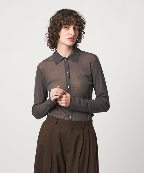 シアーな透け感のあるチュール素材が軽やかな雰囲気に仕上げてくれるシャツ型カーディガン。 新色はニュアンス感のある、シャーベットとダークグレーカラーをリリース。 ほどよくフィットするきれいめなシルエットで、ボタンを留めて一枚着やジャケットのインナーなど、着こなしの幅が広がります。 フロントのボタンをすべてはずして、軽い羽織りとしても活躍。 インナーが透けることで、着こなしに艶感を加えます。 ============================ 裏地:なし 透け感:あり 伸縮:ややあり 光沢感:なし ケア方法:手洗い可 ============================ 【注意事項】 ※画像の商品はサンプルです。 ※商品に「取り扱い上の注意書き」、「洗濯表示」がございます場合は、使用前に必ずご確認ください。 ※商品画像は、光の当たり具合やパソコンなどの閲覧環境により、実際の色味と異なって見える場合がございます。あらかじめご了承ください。 ※商品の色味の目安は、商品単体の画像をご参照ください。 店舗へお問い合わせの際は、全国の6(ROKU)各店舗まで下記の品名/品番をお申し付けください。 品名:〇6 N/TULLE SHT 26SS** 品番:86272000005