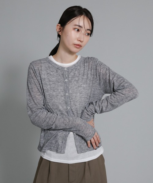 【 SELECT MOCA Et 】 SELECT MOCAから大人ブランド「Et / エト」が登場。 大人の女性の悩みや願望に共感し、寄り添ったデザインを届けたい。 スタイルの変化や生活スタイルの変化に合わせて選びたくなる服を作りたい。 そんな想いを込めて、心地よく、輝く大人でいられるスタイルをご提案します。 -point- & -styling- 一枚でも、重ねても。 二通りで楽しむ、シンプルな上質感。 薄手のカーディガンとクルーネックインナーを組み合わせたセットアイテム。 なるカラートーンのレイヤードが、さりげない奥行きを生み出します。 カーディガン・インナーはそれぞれ単品でも着用可能で、 コーディネートの幅が広がります。 インナーのノースリーブの丈を少しだけ長くしているので、 インナーの裾ラインが縦のラインを意識させ、すっきりとした印象に。 薄手の素材で着ぶくれしにくく、すっきりとしたシルエットに仕上がります。 自宅で洗えるケアの手軽さもうれしいポイント。 サテンスカートと合わせ、コントラストのきいた大人の着こなしはもちろん、 デニムやワイドパンツのカジュアルスタイルもおすすめです。 シアータンクトップシアーカーディガンアンサンブル ---------------------------- 素材 ポリエステル80%・レーヨン20% ---------------------------- 伸縮性 ★★☆☆☆ 裏地 なし ---------------------------- ※モニター・環境等により実際の商品と多少色味が異なって表示される場合がございます。 予めご了承をお願いいたします。 ======================= ■袋梱包の為、染料による特有の匂いが抜けきれず、匂いがする場合がございますが不良品にはあたりません。 上記注意点での返品、交換はお断りします。ご了承の上お買い求めくださいませ。 ■本製品は生産過程におきまして色味、サイズ感等若干の誤差が出る場合がございます。予めご了承くださいませ。 ======================= 【お買いものをお楽しみいただく為に!】 ▼商品のお気に入り登録 完売カラーの再入荷通知や、ラスト1点の通知、セールの通知も受け取ることができます。 ▼ブランドのお気に入り登録 新商品や再入荷など、いち早くブランドのお得な情報を受け取ることができます!