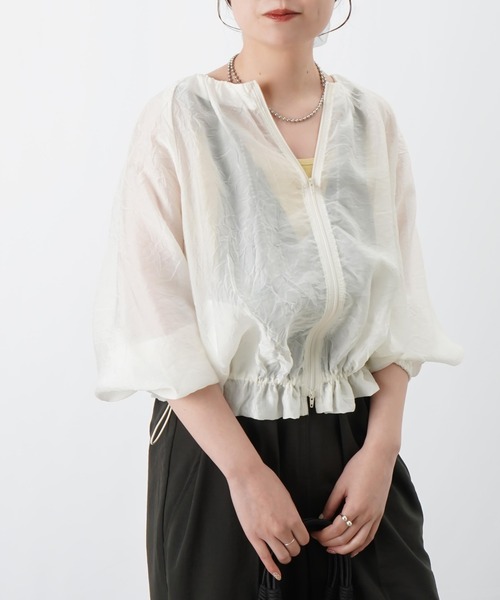 2026 Spring & Summer 【軽くて万能なワッシャーシアーブルゾン】 ◆Design ワッシャー加工施したシアーブルゾン。 表情のある軽やかな生地感が、清涼感のある印象を与えます。 ダブルジップ仕様でバランス調節がしやすく 裾のドローストリングでシルエットのアレンジも可能。 シワが目立ちにくく、気軽に羽織れる着回し力の高いアイテムです。 ◆Fabric ・しなやかさの中に程よいハリ感を持たせたレーヨン混素材。 ◆color ・オフホワイト、ブラックの2色展開です。 ◆Styling ・レースキャミソールにとろみパンツを合わせたトレンド感あるスタイルに。 ・タンクトップにパステルカラーのパンツやスカートを合わせた軽やかな春のスタイルに。 ・デニムにシアートップス、キャップを合わせた決めすぎない大人カジュアルなスタイルもオススメです◎ -------------------------------- 生地の厚さ:薄手 透け感:あり 伸縮性:なし 光沢感:なし 裏地:なし 洗濯:ドライクリーニング可 -------------------------------- 【お買い物をよりお楽しみいただくために】 〇商品のお気に入り登録 完売カラーの再入荷や、完売間近の通知、セールの通知を受けることができます。 〇ブランドのお気に入り登録 新商品や再入荷など、いち早くブランドのお得な情報を受け取ることができます。 【♡をクリック!ご登録お願いします!】