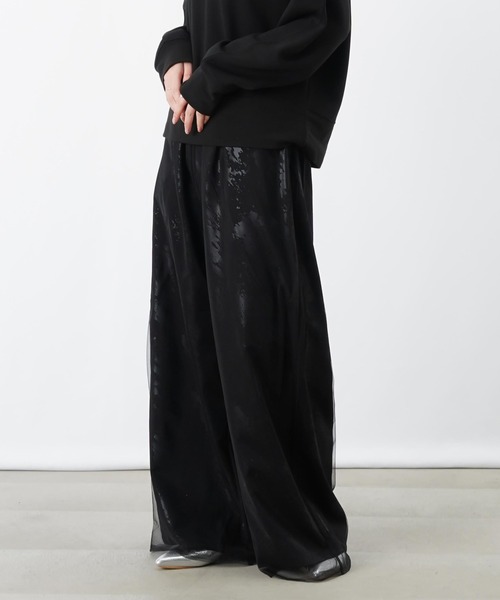 2026 Spring & Summer 【合わせるだけでトレンド感◎ジョーゼット箔プリントチュールレイヤードパンツ】 ◆Design 上品な光沢を放つ箔プリントをあしらった、華やかなデザインパンツ。 チュールをレイヤードすることで動くたびにふんわりと揺れ 女性らしい軽やかさを演出します。 ウエストは総平ゴム仕様でストレスフリーな履き心地。 裏地なしでも安心して着用でき、さっと穿くだけで コーディネートを華やかに格上げしてくれる一枚です。 ◆Fabric ・落ち感のある柔らかな素材に しなやかなチュールをレイヤードしたデザイン。 ◆color ・ブラック、シルバー、ゴールドの3色展開です。 ◆Styling ・シアーシャツと合わせたシンプルだけどサマ見えするスタイルに。 ・ジャケットと合わせてキレイめなスタイルに。 ・シンプルなショート丈のスウェットと合わせたキレイめカジュアルなスタイルもオススメです◎ -------------------------------- 生地の厚さ:やや薄手 透け感:なし 伸縮性:ややあり 光沢感:あり 裏地:なし 洗濯:手洗い可 -------------------------------- 【お買い物をよりお楽しみいただくために】 〇商品のお気に入り登録 完売カラーの再入荷や、完売間近の通知、セールの通知を受けることができます。 〇ブランドのお気に入り登録 新商品や再入荷など、いち早くブランドのお得な情報を受け取ることができます。 【♡をクリック!ご登録お願いします!】