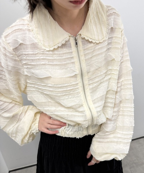 立体感のあるフリルレースを贅沢に使用した、存在感たっぷりのショート丈ブルゾン。 繊細なレースの表情と、カジュアルなジップアップデザインを掛け合わせることで、甘さとラフさのバランスが絶妙な一枚に仕上げました。 羽織るだけでコーディネートを格上げしてくれる、主役級アウターです。 首元はすっきりとしたラウンドカラー仕様で、甘くなりすぎず大人っぽい印象に。 フロントはジップアップ仕様で着脱もスムーズ。 裾と袖口にはゴムでシャーリングし、程よく丸みのあるシルエットでフェミニンな印象をプラス。 ショート丈なので脚が長く見え、視覚効果でスタイルアップ効果も期待できます。 ワンピースの上に羽織ったり、ハイウエストボトムとの相性も抜群です。 インナーにはキャミソールやタンクトップを合わせて透け感を楽しんだり、ロゴTやシンプルなカットソーと合わせてカジュアルダウンするのもおすすめ。 デニム、スラックス、スカートまで幅広いアイテムと好相性。 季節の変わり目のライトアウターとして、ワードローブに一枚は持っておきたいレースブルゾンです。