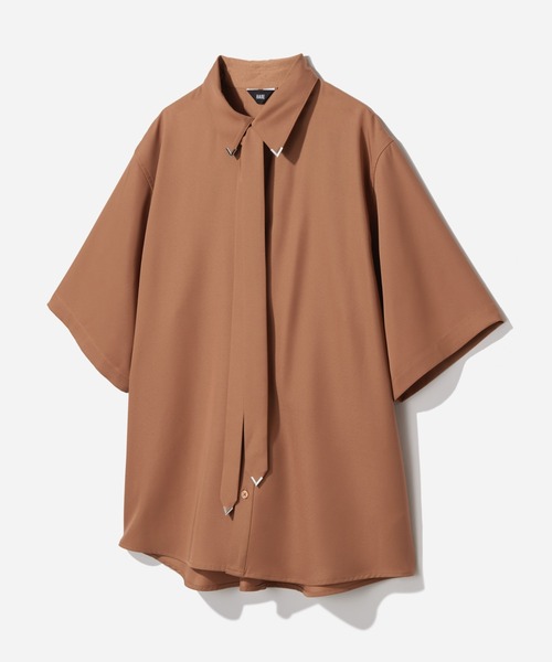 ーーー シルバーパーツとタイが織りなす、端正でラグジュアリーなモードスタイル。 ーーー DESIGN 襟先とタイの先端に配されたシルバーパーツが、アクセサリーのような繊細な輝きを放つ意匠性の高い一着。 最大の特徴である取り外し可能なボウタイは、締めればドレッシーに、外せばミニマルなレギュラーカラーシャツへと表情を変え、シーンに合わせた自在なスタイリングを可能にします。 程よいゆとりを持たせたリラックスシルエットが身体のラインを優雅に隠し、ジャケットのインナーとして合わせた際にも、首元のメタルパーツがシャープな存在感を際立たせます。 MATERIAL 上品な斜めのうねが高級感を漂わせる、美しい落ち感とハリを両立した上質な生地を採用。 適度なストレッチ性を備えているため、動作を妨げず、さらにシワになりにくい特性が、デイリーから特別なオケージョンまで凛とした美しさを長時間キープします。 同素材のパンツと合わせたセットアップスタイルでは、素材の持つしなやかな質感が最大限に引き出され、より統一感のあるハイエンドなモードスタイルを完成させます。 SET ITEM セットアップ対応アイテムはコチラを検索→【660971】 ※サンプルにて撮影をしておりますので、実際の商品とは仕様や加工・サイズ等が若干異なる場合がございます。 ※屋外の光や照明の当たり具合で、実物と色味が異なって見える場合がございます。詳細画像の色味をご確認ください。 なお、商品の色や質感を出来るだけ忠実に再現するよう心掛けておりますが、パソコンなどの環境により、実物と若干異なる場合がございます。 ※写真を許可無くコピー・転用することは固くお断りします。