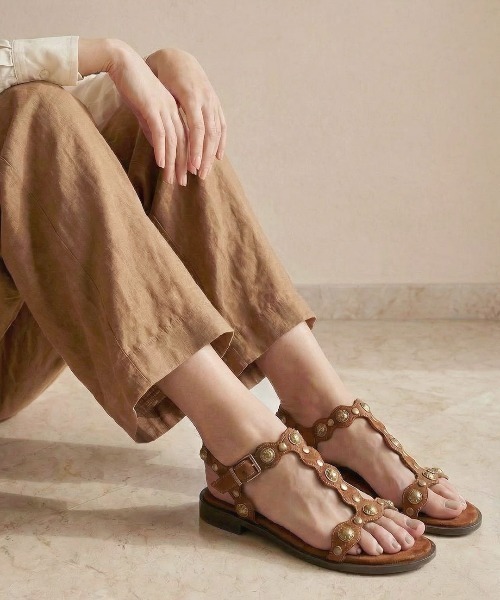 【ASH公式ショップ】 2026年 Spring&Summer COLLECTION 深みのあるブラウンカラーがモードな、スタッズデザインのスエードフラットサンダル。 やわらかな質感のアッパーに、存在感のあるスタッズを施し、カジュアルとモードの絶妙なバランスのデザインに。 ウェーブを描いた細身のストラップは、エレガントさもあるデザインに。 丸みのあるアンティーク調のスタッズはほどよいアクセントになり、シンプルなコーデにこなれ感をプラス。 また、ダークブラウンのスエードは深みと抜け感のある大人のモードスタイルを完成させます。 デニムやリネンボトムスとのナチュラルなコーデはもちろん、ブラックコーデの外しとしてもおすすめ。 履くだけで雰囲気をつくる、存在感あるストラップサンダルです。 ■ソール、つま先、かかと部分にはヴィンテージ加工が施されております。 ■天然皮革の為、色むらや軽微な傷等が残っていることがあります。