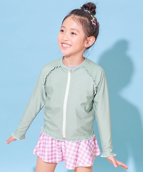 配色メロウフリルがポイントのラッシュガード。 フードなしの短め丈で、どんな水着にも合わせやすいデザインです。 スポーティーすぎるデザインは少し苦手、という女の子にぴったりなアイテムです。 毎日の紫外線からお子さまの肌を守れるように、遮蔽率90%以上の素材を使用。 水の中での着用はもちろん、水場でのレジャーシーンにもおすすめ。 夏のおしゃれをdevirockでめいっぱい楽しんでください。 ■素材 柔らかな肌ざわりをしたポリエステルストレッチ素材 さらっと柔らかな肌ざわりが特徴。 程よいストレッチなので、体にフィットし着脱しやすい素材です。 伸縮性:あり ■アピールワード 海 海水浴 プール アウトドア 紫外線対策 長袖ラッシュガード 水着 プールグッズ 水泳 ■洗濯方法 手洗い可 / 漂白剤使用不可 / 乾燥機使用不可 / 日陰つり干し/ 洗濯ネット使用 ■ご注意事項 ・摩擦や水、汗などで色が移ることがあります。ご注意ください。 ・平置きにて採寸しているため、サイズや形に多少の誤差が生じる場合があります。あらかじめご了承ください。 ・伸縮性のある素材は、砂が生地の隙間に入りシミ状に見える場合がありますので、万が一砂が入り込んだ場合は、乾いた後、生地を伸ばして叩くと落ちやすくなります。 ・高温下や濡れた状態で袋や鞄にいれて長時間放置と、色移りやプリント剥がれの原因となるためご注意ください。 ・生産時期により、多少色味が異なる場合がございますが、素材・サイズ等の品質に違いはございません。 ・ご使用のパソコンやブラウザの環境により、実際の色とは多少異なる場合がございます。 ー devirockについて ー 子育てがもっと楽しくなる社会を目指し、親と子が感じる課題を解決する""新しいあたり前""を提案しています。 男の子・女の子のデイリーウェアを中心にラインナップ。ベーシックからトレンドまで幅広いデザインと、ベビーからキッズまでの豊富なサイズ展開が魅力の子供服ブランドです。