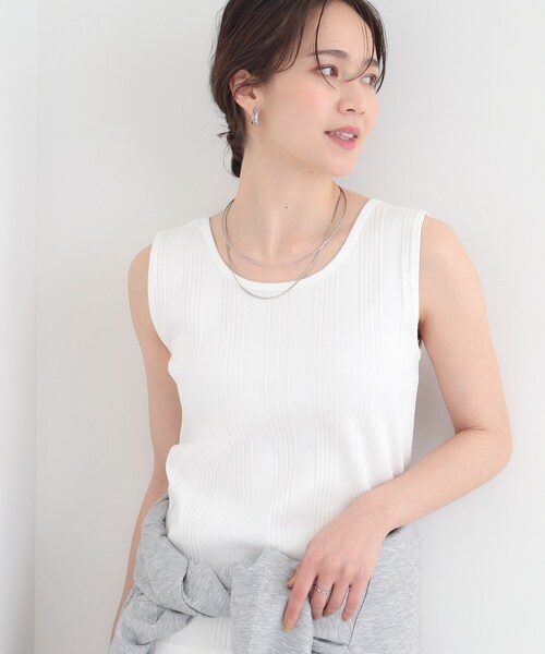 気分で着替えられる2WAY仕様です。 インナーにもトップスとしても使える、デイリーコーデの強い味方です。 【デザイン】 前後どちらでも着用できる2WAYネックラインが特徴のタンクトップ。 ベーシックに使いやすいクルーネックと、すっきり見えのスッキリ見えのスクエアネックの2WAY仕様です。 縦のリブラインが体のラインをすっきり見せてくれます。 程よいフィット感でインナー使いにも最適なシルエット。 カラーバリエーションはベーシックな無地3色と、使いやすいボーダー柄の全4色展開。 毎日コーデに合わせやすいので色違いで揃えたくなる優秀アイテムです。 【スタイリング】 シャツやカーディガンのインナーとして重ね着し、イヤードスタイルが完成します。 ボーダー柄を選べば、コーデのポイントになります。 ジャケットやブラウスと重ね着すれば、通勤スタイルにも対応できますので、どんなアイテムとも相性が良く着回し力があります。 【素材】 リブ編み、綿混素材。肌触りが良く、伸縮性のある快適な着心地。 程よいフィット感で体に沿うシルエットが特徴です。 ※製品寸法は平置きのスペックでございます。こちらの商品は伸縮性があります。 ※照明の関係により、実際よりも色味が違って見える場合があります。また、パソコン・スマートフォンなどの環境により、若干製品と画像のカラーが異なる場合もございます。 モデル情報:身長163cm B81 W59 H88 着用サイズ:02(M) 店舗へのお問い合わせ商品番号:C62-15038 ●製品寸法: 01(S):総丈56cm B74cm 肩幅30cm 02(M):総丈58cm B77cm 肩幅31cm 03(L):総丈60cm B80cm 肩幅33cm 04(LL):総丈63cm B84cm 肩幅35cm 備考: