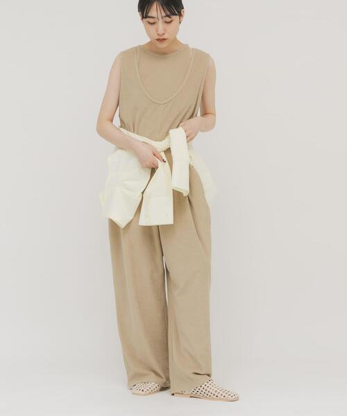 【トレンドのパイル素材を使用したオールインワン】 きれい見えが叶うトレンドのパイル素材を使用したオールインワン。リラクシーな雰囲気のオールインワンと、同素材のキャミソールがセットになっています。別々でも使用でき、セットで着ていただくとちらっと見える肌がヘルシーな印象にしてくれます。 【2026 Spring/Summer】【26SS】 ※強い力がかかると、破れる場合があります。着用時は他のものとの引っ掛けにご注意ください。 総重量(オールインワン) : 約395g ※商品画像は、光の当たり具合やパソコンなどの閲覧環境により、実際の色味と異なって見える場合がございます。予めご了承ください。 ※商品の色味の目安は、商品単体の画像をご参照ください。 ▼お気に入り登録のおすすめ▼ お気に入り登録された商品は、マイページにて現在の価格情報や在庫状況の確認が可能です。 お買い物リストの管理にぜひご利用ください。 素材感 透け感 : なし 伸縮性 : あり 裏地 : なし 光沢 : なし ポケット : あり 3836