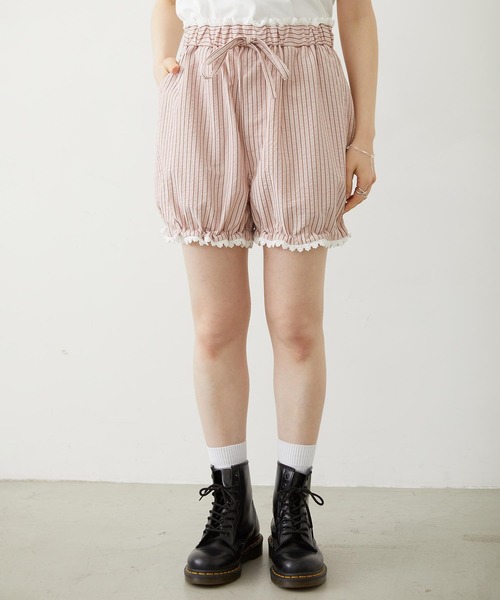 カジュアルなのに、どこか甘い。 大人のためのストライプ柄ショーツ 涼しげなストライプ柄に、裾のコットンレースでさりげない甘さをプラスしたショートパンツ。 トランクスパンツのようなリラックス感のあるディテールが、子どもっぽくならず抜け感のあるスタイルを演出します。 裾にはドローコードが付いており、きゅっと絞ってシルエットのアレンジを楽しむことも可能。 その日の気分やスタイリングに合わせて着こなしの幅が広がります。 シンプルなTシャツを合わせるだけで、頑張ってないお洒落な夏コーデが完成。 オーバーサイズのシャツを羽織った、少しメンズライクな着こなしもおすすめです。 バランスが取りやすく、スニーカーにもサンダルにもマッチ。 デイリーコーデからおうちでのリラックスタイムまで、幅広く活躍する着回しやすい一枚です。 ・透け感:なし ・伸縮性:なし ・生地の厚さ:普通 ・裏地:なし ■同シリーズ (103262031001)STRIPED RUFFLE PANTS 【MILKFED.(ミルクフェド)】 【取り扱い注意事項】 ・洗濯で多少縮むことがあります。 ・濡れたままで放置しますと色泣きしたり、また白い物に色移りすることがあります。 ・アテンションタグ・洗濯表示を必ずご確認の上、ご使用下さい。 ・画像の商品は光の照射や角度により、実物と色味が異なる場合がございます。 また表示のサイズ感と実物は若干異なる場合もございますので、予めご了承ください。 ・商品の色味の目安は、商品単体の画像をご参照ください。 ・画像の商品はサンプルとなります。実際の商品と色味、仕様、加工、サイズ、素材等が若干異なる場合がございます。 ・予約商品など一部商品につきましては、生産の都合上、お届け時期が前後する場合がございます。 《お気に入り登録》のオススメ! ▼商品のお気に入り登録 再入荷通知や、残り1点の通知、セールなどの通知も受け取ることができます。 ▼ブランドのお気に入り登録 新商品や再入荷など、ショップのおすすめトピックスなどお得な情報をいち早く受け取ることができます。