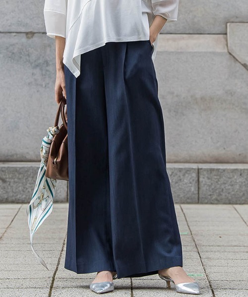【デザイン】 キュプラ特有の落ち感を活かした、デニム見え素材のストレートパンツ。 すとんと縦に落ちるシルエットで、脚のラインをすっきりときれいに見せてくれます。 軽さのある素材感のため、デニムライクでありながら重たく見えず、上品な印象に仕上がっています。 ウエスト後ろはゴム仕様で、見た目のきちんと感を保ちながら快適なはき心地を実現。 フロントはファスナーあきで着脱しやすく、ポケット付きで実用性も備えています。 裏地なしの軽やかな仕様で、ロングシーズン活躍する一本です。 【素材】 レーヨンとキュプラをベースに、横糸にアセテートを使用した素材。 キュプラならではの美しい落ち感に、アセテート特有のキシミ感と程よいハリ感をプラスしています。 軽さと上品な光沢があり、デニム見えしながらも大人らしい表情が魅力。 ご自宅で洗えるイージーケア素材です。 ---------------------------------------------------------------- 洗濯方法 家庭洗濯:液温は30℃を限度とし、洗濯機で非常に弱い洗濯ができる。 自然乾燥:日陰の吊り干しがよい。 アイロン:底面温度120℃を限度としてアイロン仕上げができる。 ドライクリーニング:石油系溶剤による弱いドライクリーニングができる。 ---------------------------------------------------------------- ■モデル身長 165cm/着用サイズ 9号 ※商品タグに記載されたサイズはヌードサイズです。実際の商品のサイズは商品情報の実寸をご確認ください。 ※画像の商品はサンプルとなりますので実際の商品と仕様、加工、サイズが若干異なる場合がございます。 ※お客様のモニター環境により実際のお色と多少異なる場合がございます。 ※撮影状況や光の当たり具合により、色合いが異なって見える場合がございます。 ---------------------------------- ▼商品のお気に入り登録 ハートマークをクリックし、お好きなカラーを選んでお気に入りに登録 完売カラーの再入荷通知や、ラスト1点の通知、セールの通知も受け取ることができます。 ▼ブランドのお気に入り登録 新商品や再入荷等、いち早くブランドのお得な情報を受け取ることができます。 ----------------------------------