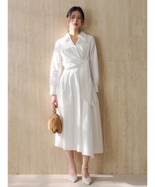 フィットアンドフレアが美しいシルエットを叶えるシャツワンピース ■ Design 構築的なフィットアンドフレアシルエットにカシュクールデザインを組み合わせたシャツワンピース。 メリハリのあるラインが美しく自然なスタイルアップを叶えます。 程よく開いたネックラインが顔まわりをすっきりと見せ抜け感を演出。 フロントのリボンディティールもアクセントに。 ■ Fabric 程よくハリ感のあるシャツ素材を使用。 スカート部分には裏地がついているので透け感を抑えます。 ■ Coordinate 袖口を捲って手首を見せてあげるスタイリングがおすすめ。 抜け感が出て全体のバランスをきれいに見せてくれます。 =================================== 裏地:あり(スカート部分) 透け感:ややあり(WHITE) 光沢感:なし 伸縮:なし ケア方法:マシンウォッシュ ===================================
