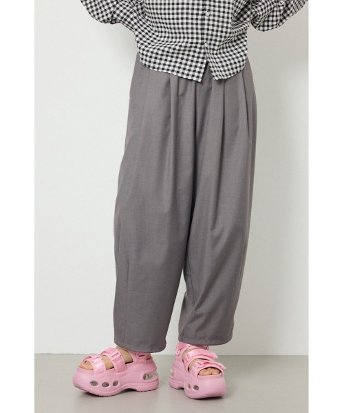 SPRING & SUMMER ( 春服 / 夏服 ) ■ポイント トレンドのコクーンシルエットが脚のラインを拾いすぎず、きれいに魅せてくれるパンツ。 ウエストはゴム仕様でリラックスして着用いただけます。 ウエストとポケットのタックが立体感のあるシルエットに見せてくれます。 ■ディテール ウエストにタックとギャザーをたっぷり入れているので腰まわりのラインを拾わず体系カバーが叶います。 裾にダーツを入れたコクーンシルエットはトレンドの着こなしを実現。 リラックス感がありながらカジュアルすぎず、幅広いシーンで活躍する1本です。 ■スタイリング 着用するだけで今年らしいスタイリングが完成。 シャツやニットなどカジュアルなトップスとの合わせがおすすめです。 やや太めのウエストゴムデザインのため、トップスインやショート丈トップスとも相性抜群。 ■生地 TR素材を使用し、落ち感があり手触りの良い素材感。 ■透け感:なし ■裏 地:なし ■伸縮性:なし ■光沢感:なし ※お取り扱い上のご注意 素材の特性上、濃色は色落ちや色移りが生じる可能性がございます。 [注意事項] ※画像の商品はサンプルです。実際の商品と仕様、加工が若干異なる場合があります。 ※画像の商品は光の照射や角度、お使いのモニター環境により、実物と色味が異なる場合がございます。 ※着用、お取り扱いの際は、アテンションタグをご確認ください。 ※弊社管理上のカラーを表記しており、タグのカラー表記と異なる記載となっている場合がございます。 ※こちらの商品は、RODEO CROWNS WIDE BOWL 独自の採寸方法となっています。本サイトのサイズガイドと採寸方法が異なる場合がありますのでご了承ください。 ▼商品のお気に入り登録 お気に入りアイテムの再入荷・在庫1点などの通知を受け取ることができます。 ▼ブランドのお気に入り登録 新作アイテムの入荷や人気アイテムの再入荷、おすすめトピックスなど、いち早くブランドの情報を受け取ることができます。