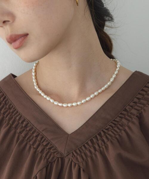 天然の淡水パールを使用した日本製ネックレス 少しだけ大きさの違う2種類のパールを組み合わせ、奥行きのある仕上がりに。 表情豊かに放つ楽しい艶が、カジュアルコーデにも合わせやすいポイントになります。 シンプルな1連パールなのでオケージョンにもおすすめです。 小ぶりながらも形を厳選した質の良い淡水パールを使用しているので、程良い存在感で一本使いでも重ね付けにも使いやすいデザイン。 アジャスターが付いているので首周りの長さ調節も可能です。 【2026 Spring/Summer】【26SS】 総重量 : 約23g ※商品画像は、光の当たり具合やパソコンなどの閲覧環境により、実際の色味と異なって見える場合がございます。予めご了承ください。 ※商品の色味の目安は、商品単体の画像をご参照ください。 ▼お気に入り登録のおすすめ▼ お気に入り登録された商品は、マイページにて現在の価格情報や在庫状況の確認が可能です。 お買い物リストの管理にぜひご利用ください。 One