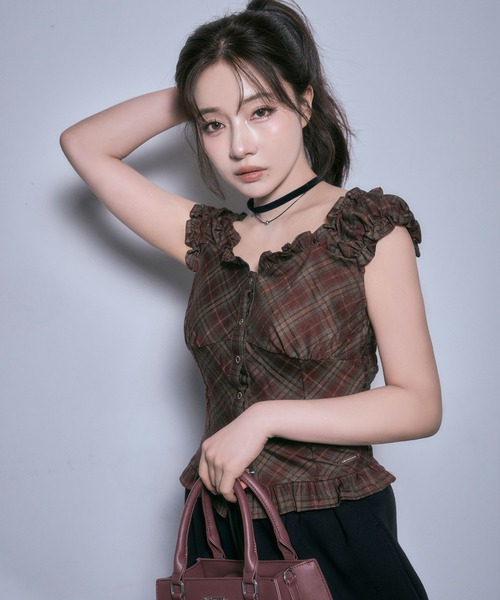 深みのある色味が甘くなりすぎない、コンパクトシルエットのトップス。シャーリングやフリルのディテールがさりげないアクセントとなり、シンプルながらも表情のある仕上がりです。 デニムやカーゴパンツなどのカジュアルアイテムはもちろん、スカートと合わせたスタイルにもおすすめです。