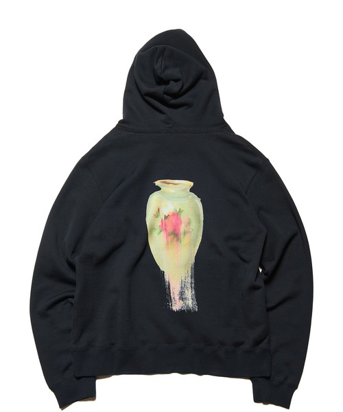 ウクライナ・キーウ出身のアーティスト、Michael Chernoがドイツ・ハンブルクでの「アカデミック・ヴァンダリズム」展(2024)に出品した作品〈VASE〉をコットンスウェットフーディーの背面に大胆にプリント。フロントにはMichael氏が本コラボレーションのために書き下ろしたuniform experimentのハンドドローイングロゴをあしらっています。他に同作品を用いたクルーネックTシャツも展開。