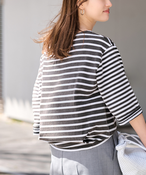 ベーシックなボーダー生地に特殊な製品洗いを施し、表面のフェード感でヴィンテージライクな表情を引き出した一枚。 程よくこなれた質感がスタイリングに自然な抜け感をプラス。 後ろ裾に入れたタックが立体的なシルエットを生み、シンプルな中に程よいデザイン性を加えています。 一枚で着映えする、デイリーに使いやすいアイテムです。 ********************** 透け感:なし 裏地:なし 伸縮性:あり 光沢感:なし 生地の厚さ:普通 ********************** ※ブルーA(045)は加工の特性上、裏側の生地全体で、場所によって色にムラが見られる場合があります。 製品仕様としてあらかじめご了承ください。 ※取り扱いについては、商品についている品質表示でご確認ください。 ※こちらの商品は、FRAMeWORK での取り扱いになります。 直接店舗へお問い合わせの際は FRAMeWORK 店舗へお願い致します。 ※照明の関係により、実際よりも色味が違って見える場合があります。 またパソコン・スマートフォンなどの環境により、若干製品と画像のカラーが異なる場合もございます。 予めご了承の上ご注文ください。 ※商品の色味は、商品アップ画像をご参照ください。 本体:手洗い可能