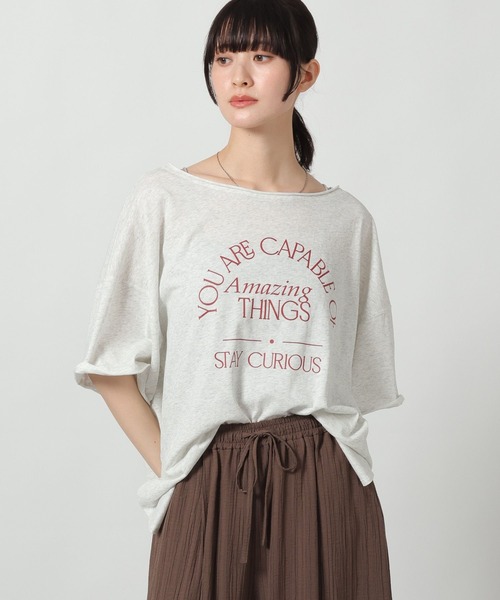 ゆったりとしたデザインがポイントのTシャツ。 薄手の素材感はこれからの時期にも着やすく、広めの襟元はデコルテを綺麗に見せてくれるデザイン。 フロントのプリントもアクセントになり1枚でスタイリングの主役になるアイテムです。 【素材】 綿混の柔らかな素材感。 やや透け感のある薄手の素材で着心地の良さも〇 【スタイリング】 カジュアルなアイテムなのでデニムとの相性〇 着丈が長めなのでタックインしシルエットに変化を付けたスタイリングもおすすめです。