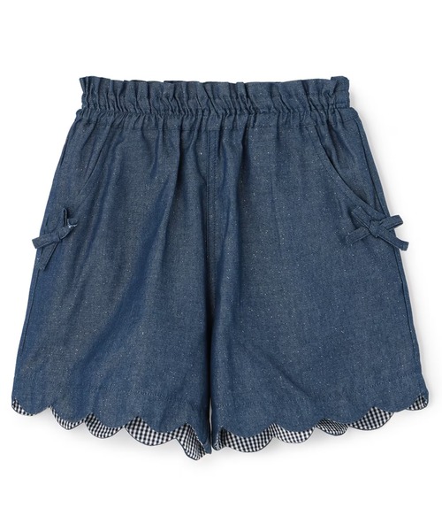 裾のスカラップが可愛らしいデニムのショートパンツ。ラメがさりげなくきらめく素材で、Aラインのチュニックはもちろん、シンプルなTシャツとも好相性です。ウエストに寄せたギャザーは見た目のポイントにもなり、総ゴム仕様で穿きやすいのも嬉しいところです。