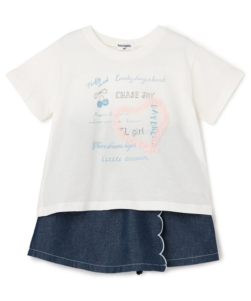 ロゴプリントにチュールのハートモチーフをあしらったTシャツと、ラメデニムのラップショートパンツのセット。Tシャツの身頃には、虫を寄せつけにくい加工を施しています。ショートパンツのウエストは、穿きやすいゴム仕様。セットでコーディネートが手軽に決まり、それぞれ単品でも着回しが利くので、デイリーに大活躍しそう。ギフトアイテムとしても、おすすめです。