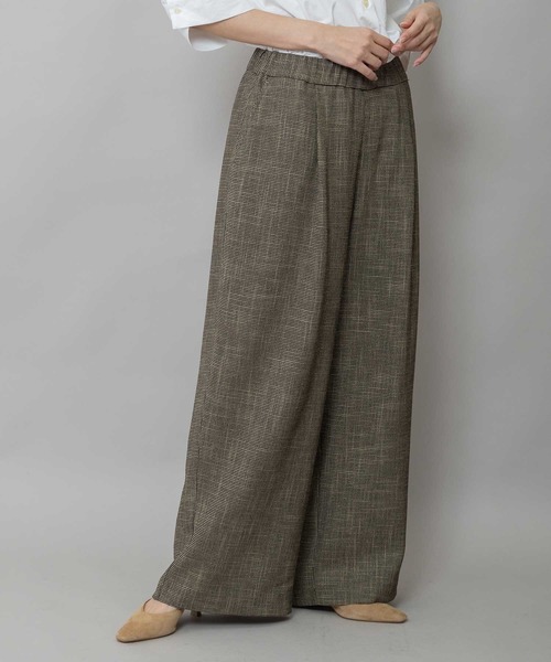 □ Munich 2026 spring & summer collection □ ◆見た目以上の清涼感で酷暑にも使えるキレイ目イージートラウザーズ◆ <MATERIAL> ウールのような膨らみと程よいハリ、コシのある梳毛調合繊トリクシオンに、滑らかな質感とドレープ性が特徴のレーヨン混スラブ糸を使用したカラミ織です。 風通しがよく吸水速乾性が抜群なので汗をかいても乾きやすく快適に過ごせます。 ツイードライクでリュクスな素材感ですがイージーケアで長いシーズン着用できるので、春先から秋が深まるころまでしっかり使えます。 <DESIGN> リラックス感強めの1タックワイドシルエットにゴムベルトのウエスト仕様でデイリーに使えるイージーな穿き心地のワイドパンツです。 適度にハリとドレープ性を兼ね備えた生地特性によってボリューム感を保ちつつ股下でキレイにドレープが出て、カジュアルながら品のあるワイドシルエットになります。 ショート丈やコンパクトなトップスと相性がよく、タンクトップやTシャツからブラウス合わせまで幅広いアイテムと組み合わせできるアイテムです。 同素材のジレ(ブランド品番MN261B46)とのセットアップでトレンド感ある着こなしもオススメです。 <COLOR> ■ブラック:夜の静けさをそのまま閉じ込めたような、深みのあるマットブラック ■ベージュ:やわらかなベージュに黒糸が絡みあう立体感のあるニュアンスカラー ■ブラウン:光の加減でブラウンのニュアンスが浮かび上がる、奥行きのあるカラー ※光のあたり具合いやパソコンなどのモニター環境によって実際の色味と異なって見える場合がございますので、予めご了承ください。 ※着用商品はサンプルです。サイズ等の仕様に若干の変更がある場合がございますので、予めご了承ください。 ※お取扱いについては、商品についております品質表示、アテンションタグにてご確認ください。 洗濯:洗濯機洗い可 .............................≪INFORMATION ≫............................ ▼商品のお気に入り登録▼ 『♡』マークを押してお気に入り登録して頂いた商品は、セール開催の通知やクーポン発行などのキャンペーンなど、お得な情報をいち早く受けとる事が出来ますので、ぜひご登録ください。