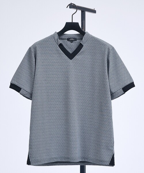 上品に映えるチェックジャガードTシャツ Finley Check Jacquard S/S V Neck 【素材】 追撚したポリエステル糸を使用し、ストレッチ性と程よいハリ感、ドライな肌触りを兼ね備えた素材です。 【デザイン】 ネック、袖口、サイドスリットに変わり編みリブをデザインしたVネックTシャツ。ジャガード織りでチェックを表現し、カジュアルながらも上品さも併せ持つ一枚に仕上げました。 【コーディネート】 細身のスラックスやデニムとの合わせから、セットアップのインナーとして幅広く活躍します。