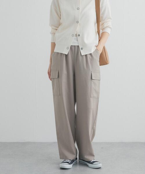 麻混落ち感素材、スッキリシルエットカーゴイージーパンツ 麻混の落ち感あるきれい目素材を使用したカーゴパンツは、スッキリシルエットに仕上げたイージーパンツ仕様。 ラフに穿ける快適さがありながらも、上品な表情が大人のスタイリングに馴染みます。 カジュアルアイテムでありながら、女性らしい素材感が程よく抜け感をプラス。 Tシャツ合わせはもちろん、ブラウスやコンパクトトップスとも好相性です。 足元はバレエシューズやサンダルを合わせれば軽やかで洗練された印象に。 デイリーからお出かけまで幅広く活躍する一本です。 【2026 Spring/Summer】【26SS】 ※商品画像は、光の当たり具合やパソコンなどの閲覧環境により、実際の色味と異なって見える場合がございます。予めご了承ください。 ※商品の色味の目安は、商品単体の画像をご参照ください。 ▼お気に入り登録のおすすめ▼ お気に入り登録された商品は、マイページにて現在の価格情報や在庫状況の確認が可能です。 お買い物リストの管理にぜひご利用ください。 素材感 透け感 : なし 伸縮性 : なし 裏地 : なし 光沢 : なし ポケット : あり SM
