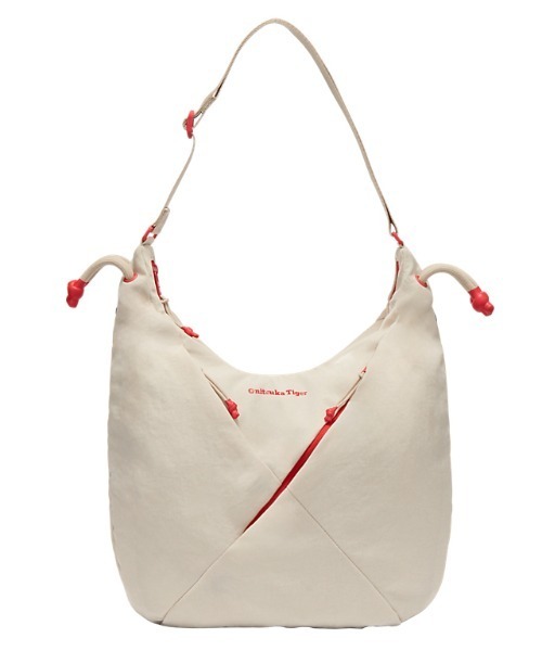 洗いをかけたような風合いの生地が特徴のショルダーバッグ。 ■シンプルなスタイルにシリコンディップの紐がデザインアクセント フロントに立体的なボディと同色のブランドロゴを配したシンプルなデザイン。色の主張を抑えた表現が、デイリーユースに馴染みやすい印象をつくる。ストラップは長さを調整、両サイドの紐を絞ることでコンパクトな持ち運びが可能。紐の先にはシリコンディップが施されており、スタイルにアクセントを添えている。 ・フロントと内側にファスナー付きポケットを配置 サイズ(単位 : cm):幅39×高さ31×マチ15
