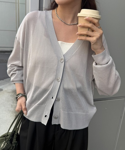【軽い生地感で夏まで活躍するカーディガン】 程よい透け感で着回ししやすいシアーVネックカーディガンです。 落ち着いた透け感なので肌店が苦手な方にもオススメのアイテム。 また、柔らかく軽い生地感なので冷房が効いている室内などでの防寒アイテムとしてもオススメです◎ 首元は深めに開くVネックなのでボタンを閉じて着てもすっきり感をキープしたまま合わせられます。 袖口や裾のリブ切り切り替えがあることで広がりすぎないシルエットに。 程よくゆとりのあるシルエットなのでスタイルカバーも叶います。 【商品ポイント】 ・程よい透け感でスタイルカバーも叶う ・深めのVネックデザインで顔周りすっきり ・夏場の冷房が効いている室内での防寒アイテムとしてもオススメ ---------------------------------------------------- ■商品特徴 洗 濯 方 法 :家庭洗濯不可(ドライクリーニング可) 裏 地 :なし 透 け 感 :あり 伸 縮 性 :なし 光 沢 感 :なし 生地の厚さ:薄め ---------------------------------------------------- ■素材 レーヨン89%, ナイロン11% ---------------------------------------------------- ※着用、お取り扱いの際は、商品についている品質表示とアテンションタグを必ずご確認下さい。 ※商品タグに記載されている商品名がWEBでの表記名と異なる場合があります。 ※実際の商品と仕様、加工、サイズが若干異なる場合がございます。 ※照明の関係により、実際よりもやや明るく見える場合がございます。 またパソコンなどの環境により、若干製品と画像のカラーが異なる場合もございます。予めご了承くださいませ。 【お気に入り登録】してお得な情報をCHECK!! ・「商品のお気に入り登録」で再入荷通知や、ラストの通知、セール通知も受け取ることができます。 ・「ブランドのお気に入り登録」で新商品や再入荷など、お得な情報を受け取ることができます。