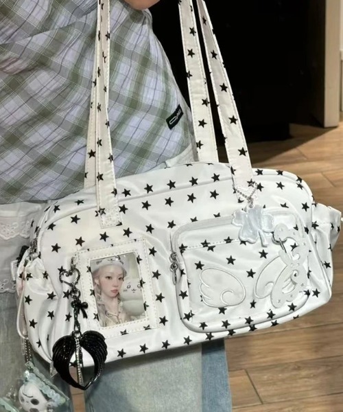 星柄が目を引く、エンジェルコアな雰囲気たっぷりの【推し活】ハンドバッグ☆クリアポケット付きで、推しのトレカや缶バッジを入れて“見せる収納”が楽しめるデザイン表面ポケットにはエンジェルの刺繍をあしらい、トレンド感のあるガーリーなアクセントに仕上げていますストラップ付きなのでハンドバッグとしてもショルダーバッグとしても使える2WAY仕様です◎ ナイロンとポリエステル素材を使用し、軽くて扱いやすいのがポイントデイリーの持ち歩きはもちろん、イベントや遠征にも使いやすい素材感です! 推し活イベントやライブ、カフェ巡りなどのお出かけにぴったりミニスカートやガーリーコーデに合わせると、エンジェルコアな雰囲気がさらにアップします♡推しのトレカや缶バッジを入れて、自分だけの“推しバッグ”を作れるアイテムです -お買い物をお楽しみいただくために- ◆Instagram◆ lacvert_official 新作情報やルックを配信中 ◆この商品が気になったらお気に入り登録 完売カラーの再入荷通知やセール情報、ラス1情報などの通知を受け取ることができます♪ ◆LAC VERTをお気に入りブランドに登録 新商品や入荷情報を受け取ることができるので、いち早く新作をチェックできます!是非ご登録してくださいね♪ ※ぬいぐるみ・チャームは付属しておりません ※撮影時のライティング、ご覧になっているモニター・PC環境により、実際の商品と色味が異なって見える場合がございます。予めご了承をお願い致します。 韓国 韓国ファッション 韓国風 大人 韓国通販 かわいい 可愛い おしゃれ オシャレ プチプラ トレンド 量産型 通勤 通学 ペアルック プチプラ 大人かわいい オタ活 オタクバッグ オタク 推し活 推し 推しバッグ バッグ トレンド 痛バッグ 痛バ ウィッシュコア 星 スター 羽 トレカケース ぬいケース