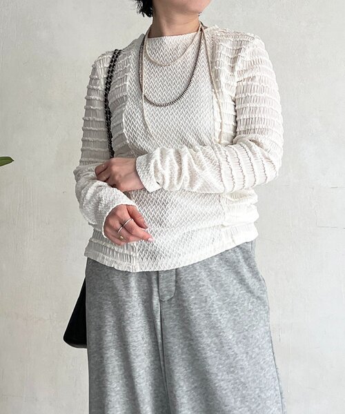 2種類のシュリンク素材が表情豊かなカットソー ‐POINT‐ ・シュリンク素材の切り替えが洗練されたおしゃれデザイン ・さらっとした快適な肌触りでべたつきにくい ・シルエットや色味はベーシックなので、着回しやすい◎ ・ジャケットやシャツのインナーとして仕込んでこなれコーデに -------------------------------- お手入れ:液温は30℃を限度とし、洗濯機で非常に弱い洗濯処理ができる。 透け感:白のみややあり 裏地:なし 伸縮性:ややあり ポケット:なし 光沢:なし 生地感:やや薄手 -------------------------------- 【♡をクリックでお得な情報をお知らせいたします】 〈商品のお気に入り登録〉 お気に入りアイテムのお値下げ・再入荷・在庫ラスト1点など通知を受けることができます。 〈ブランドのお気に入り登録〉 un dix corsの新商品や再入荷、セール、クーポン配布などお得な情報を受けとることができます。 -------------------------------- ※掲載商品のお色味は撮影場所やお使いのモニター環境により若干異なる場合がございます。 特に、ロケ撮影では明るく見える傾向にございます。予めご了承ください。 ※生産の都合上、お届け時期が前後する場合がございます。 ※着用、お取り扱いの際は商品についている品質表示とアテンションタグを必ずご確認ください。 ※本商品は畳んだ状態で袋に入れて入荷するため、開封時に折りシワが生じる場合がございます。 ご着用前に整えていただくことで、きれいにお召いただけます。
