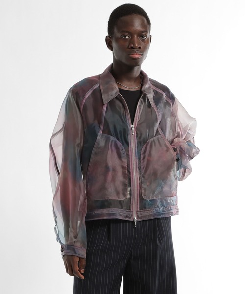 ーーー 光と影が織りなす幻想的なシアー感。モードの真髄を纏うブルゾン。 ーーー DESIGN 透け感のあるオーガンジー素材をベースに、インナーとの重なりで無限の表情を生み出すフェイクレイヤード・ブルゾン。 ボディ全体に施された波打つような抽象的なグラフィックが、動くたびに光を反射し、まるでオーロラのような幻想的な奥行きを演出します。 フロントの重厚なメタルジップや、立体的な曲線を描くポケットの切り替えディテールが、シアー素材の繊細な質感にシャープな緊張感を与え、都会的で凛とした佇まいを完成させました。 襟付きのオーセンティックなブルゾン型を採用することで、アート性の高いデザインを日常のモードスタイルへと見事に昇華させた、HAREらしい独創的な一着です。 MATERIAL 繊細な透け感と、ハリのある上品な質感を両立させたポリエステル100%のオーガンジー素材を採用。 極細の糸を高密度に織り上げることで、肌を滑るような滑らかさと、空気を孕んだような驚くほど軽やかな着用感を実現しました。 素材表面には特殊な加工による美しい光沢を施し、光の角度によって色が移ろうメタリックな質感が、シンプルなコーディネートに圧倒的な華やかさを注入します。 型崩れしにくく、美しいシルエットを長時間キープできるため、春夏シーズンの羽織りとしてはもちろん、冬場のレイヤードのアクセントとしても活躍する、意匠美と機能性が融合した逸品です。 ※サンプルにて撮影をしておりますので、実際の商品とは仕様や加工・サイズ等が若干異なる場合がございます。 ※屋外の光や照明の当たり具合で、実物と色味が異なって見える場合がございます。詳細画像の色味をご確認ください。 なお、商品の色や質感を出来るだけ忠実に再現するよう心掛けておりますが、パソコンなどの環境により、実物と若干異なる場合がございます。 ※写真を許可無くコピー・転用することは固くお断りします。